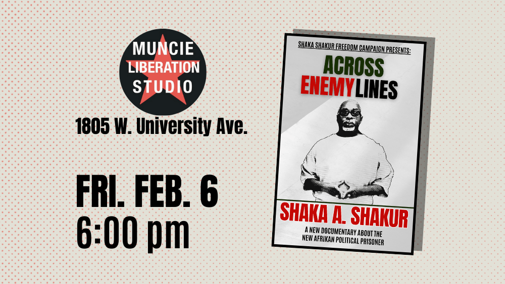 The Muncie Liberation Studio is hosting a screening of the new Shaka A. Shakur documentary, “Behind Enemy Lines.” Just a three hour drive from Shaka’s hometown, the Muncie Liberation Studio has, for two years, served as a physical space in Muncie serving to educate, organize, and agitate for a better world for all.